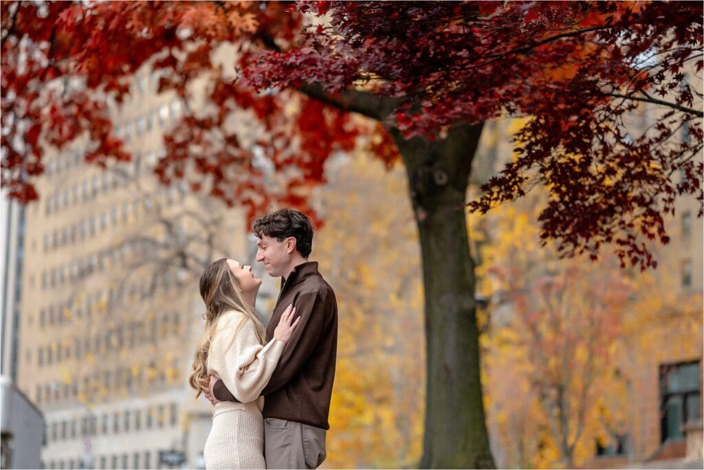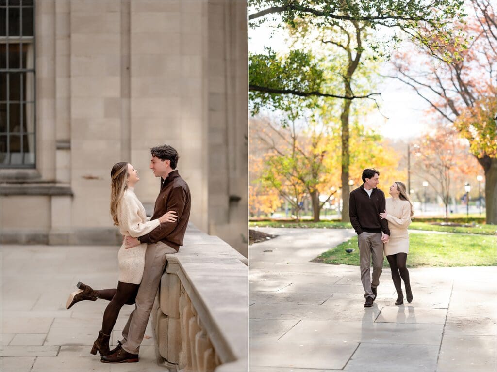Engagement photos on PITT Campus in the fall season? Yep! The best time to photograph them? Sunday morning!! Campus was quiet, but the leaves were showing off. Sure, it was chilly, but we really got the best that campus had to offer this morning. We photographed their engagement session around the Cathedral of Learning and the William Pitt Union, and talked about their wedding next year at Oakmont Country Club. We will be hitting up the Church Pews then, so be on the lookout for their wedding next August! Paul gave me the task of coming up with something cool at the Church Pews, so I’m already brainstorming!