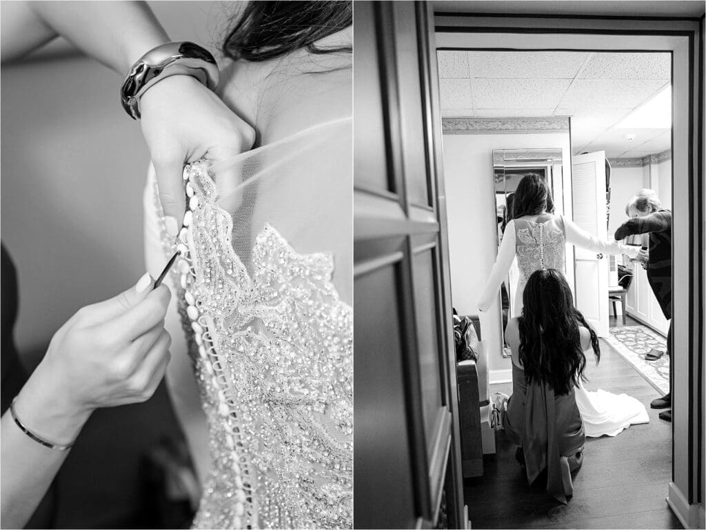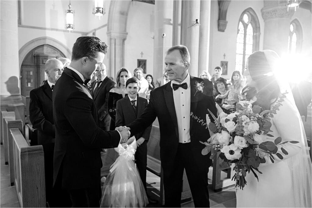 When I arrived (I was with them for 3 hours), I photographed candids and the ‘getting ready’, as well as any family portraits that I could grab at the time. This allowed me to get to know the people in the immediate families and arrange my lights for the ceremony. St. Bernard has a room downstairs for brides to get ready, so Lindsay put on her dress in this area and got to see her Dad for the first time as well (some tears were shed!).