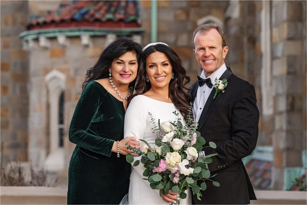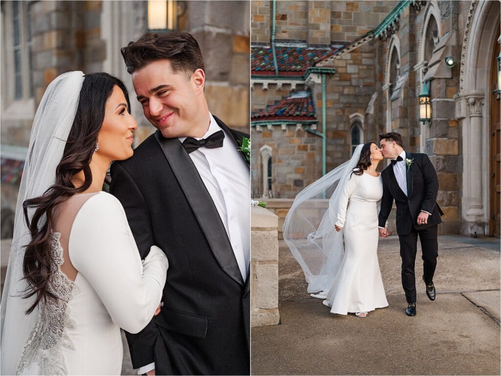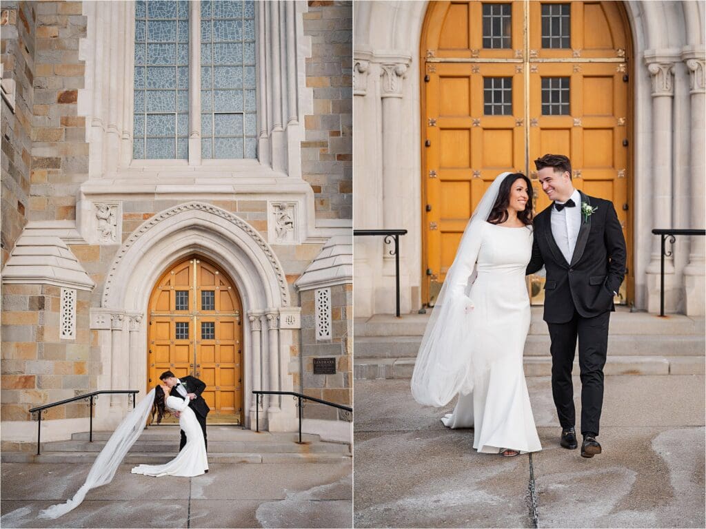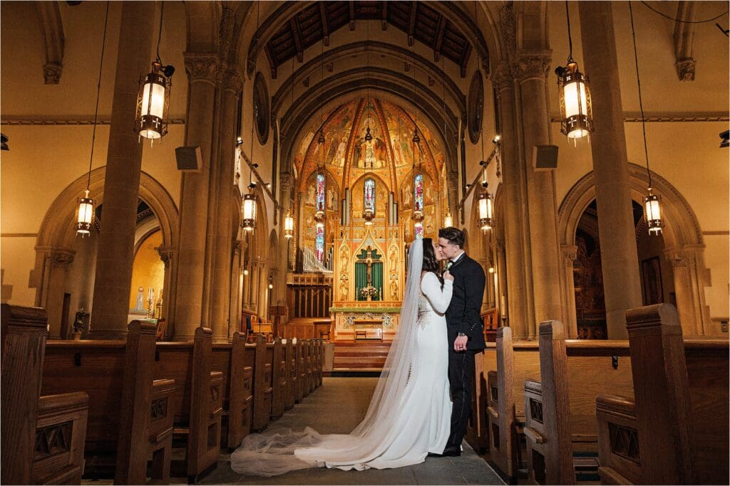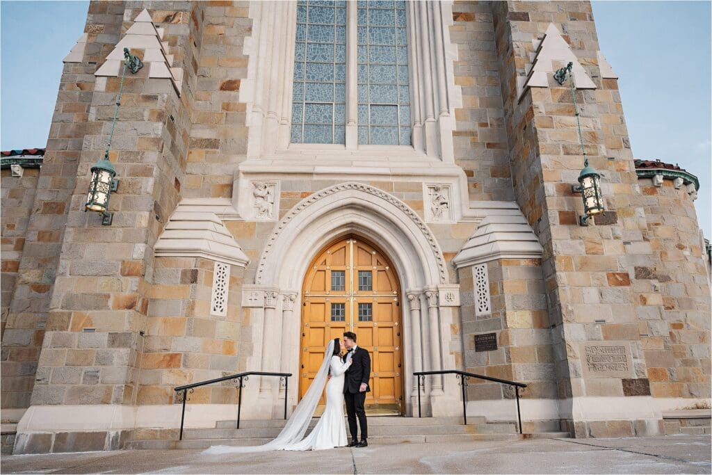 After the ceremony, we did our formal family photos at the altar, and then a few photos of the couple inside of St Bernard with the architecture. Afterwards, we headed outside to the area I spoke of before where the winter weather treated us nicely in the temperatures and we had the most perfect evening sunlight shining on it. I LOVE their classic portraits from the day – the look SO good. Winter weddings ALWAYS look good!!