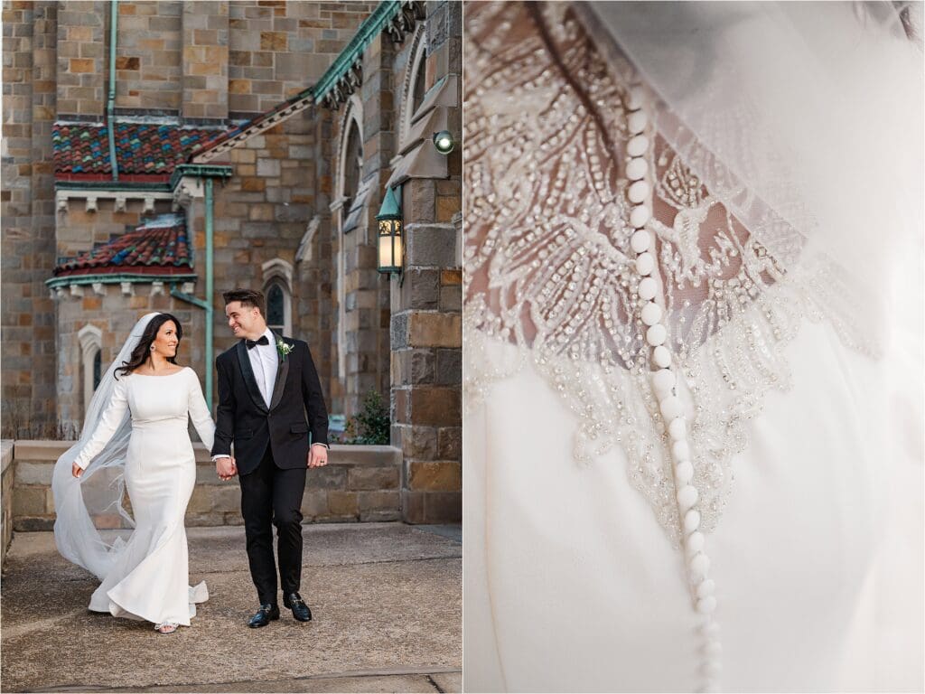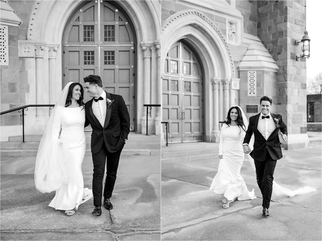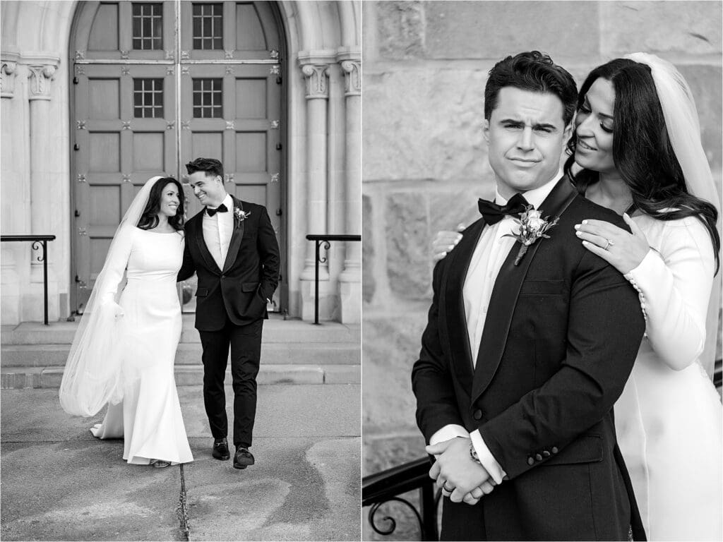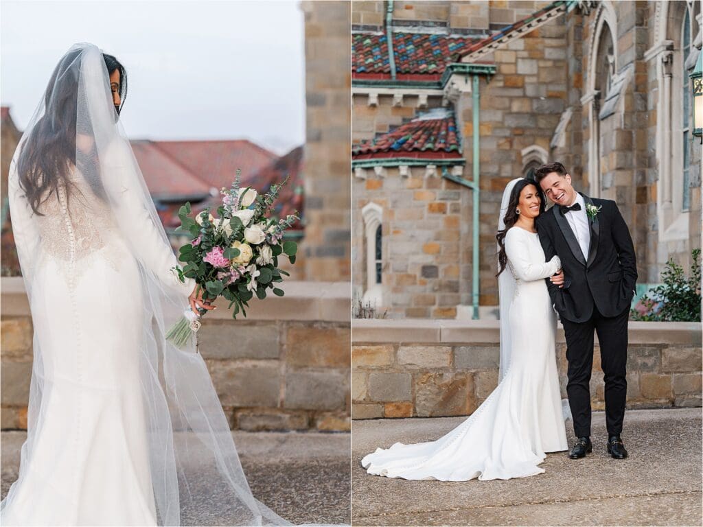 After the ceremony, we did our formal family photos at the altar, and then a few photos of the couple inside of St Bernard with the architecture. Afterwards, we headed outside to the area I spoke of before where the winter weather treated us nicely in the temperatures and we had the most perfect evening sunlight shining on it. I LOVE their classic portraits from the day – the look SO good. Winter weddings ALWAYS look good!!